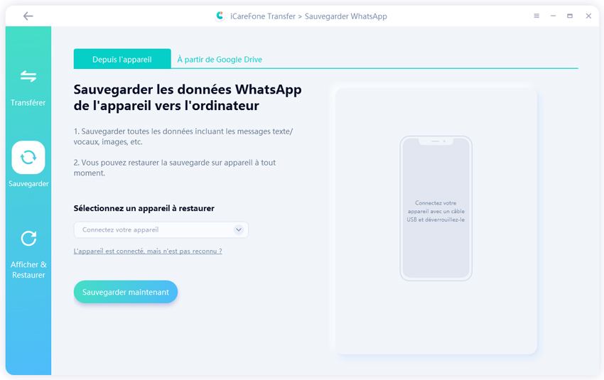 Dans le menu principal, choisissez « Sauvegarde » dans le panneau de gauche pour voir comment sauvegarder WhatsApp sur votre PC/Mac. Ensuite, sélectionnez « Depuis Google Drive » dans le menu supérieur, puis cliquez sur « Sauvegarder maintenant ».