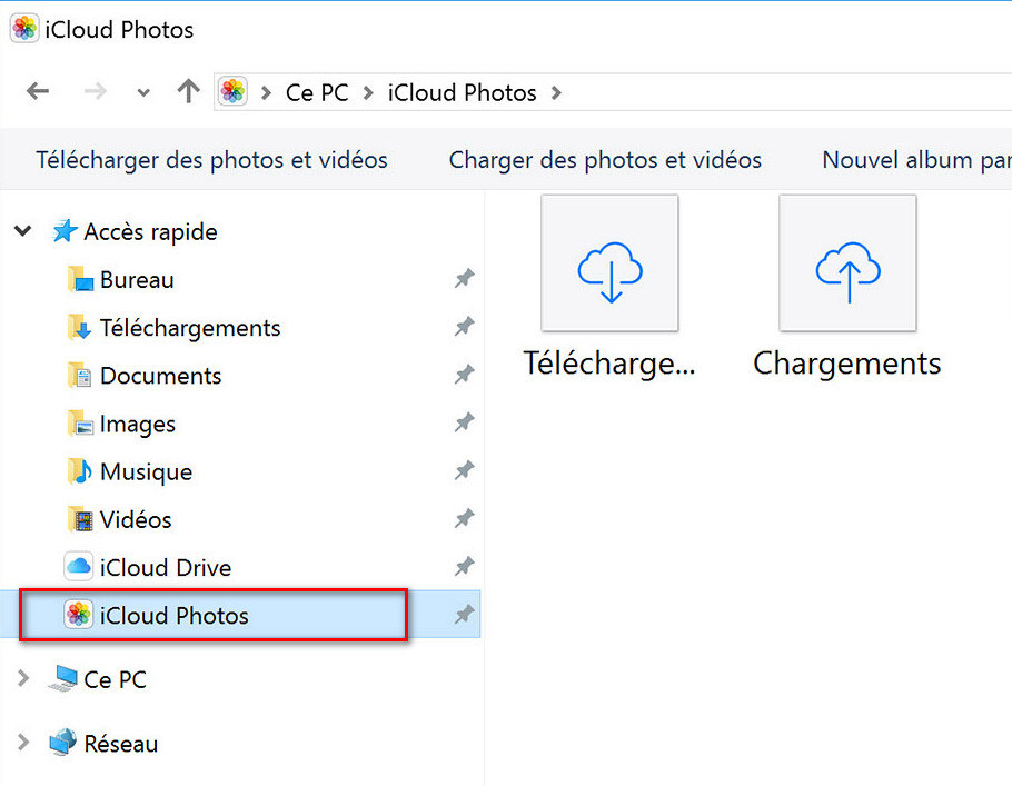 Ouvrez iCloud pour Windows, cochez Photos et cliquez sur Options pour vérifier que Bibliothèque de photos iCloud est activée. Ouvrez l'Explorateur de fichiers et allez dans iCloud Photos pour voir et télécharger vos photos.